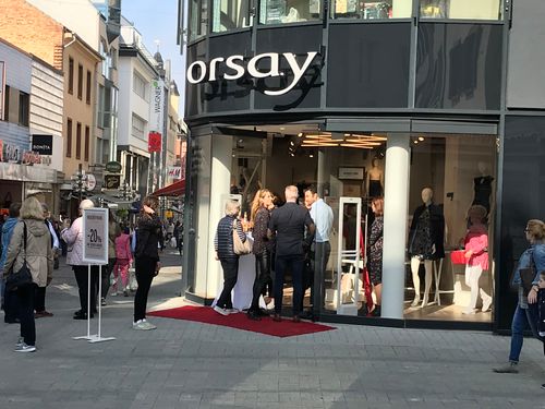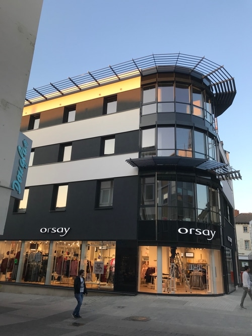 Modernisierung eines Geschäftshauses aus den 60er Jahren in der Fußgängerzone. Erweiterung der Ladenfläche der Textilkette Orsay. Anbau eines Glasturms an der Gebäudeecke Mannheimerstr./Römerstraße zur städtebaul. Akzentuierung. Büroflächen im 1.+2.OG, Penthousewohnung im 3.OG